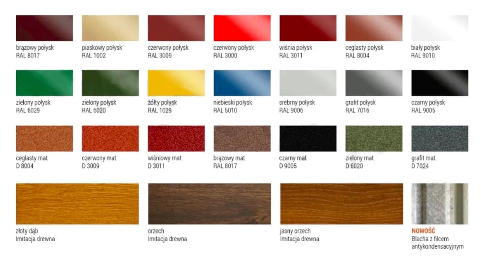 - Wkręty i nity (z palety kolorów RAL) w kolorze blachy