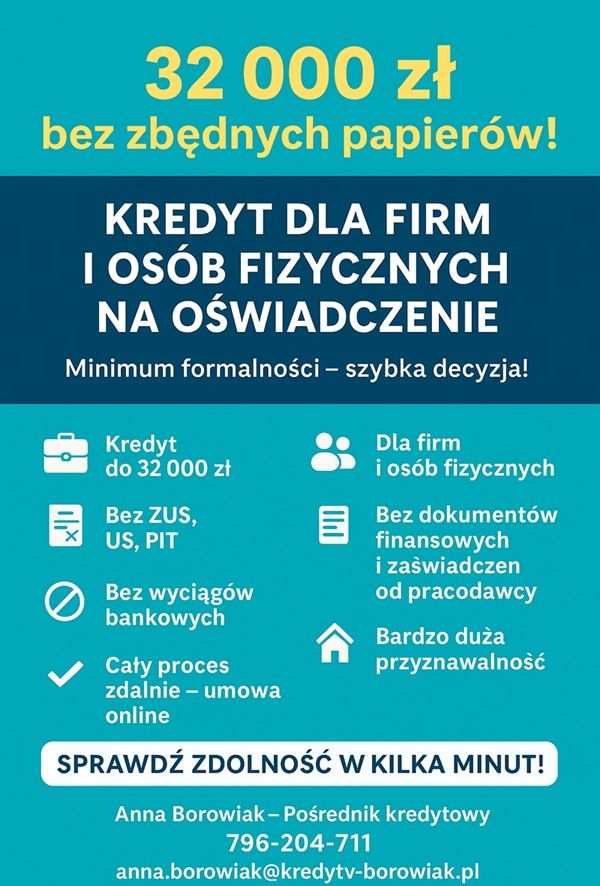 KREDYT DLA FIRM I OSÓB FIZYCZNYCH NA OŚWIADCZENIE – do 32 000 zł